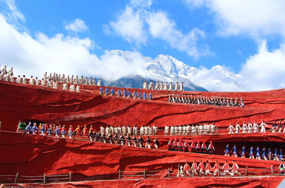 麗江一帯に住むナシ族の宗教であるトンパ教の聖地、前人未到の処女峰「玉龍雪山」(往復とも氷河公園ロープウエイを利用して富士山超えの氷河展望台で大迫力の氷河パノラマを見学!)、中国映画界の巨匠、張芸謀監督がプロデュースした大規模なショーで、玉龍雪山の壮大な自然風景をバックに海抜3,100メートルの玉龍雪山の蓝月谷にある野外ステージ「印象麗江」ショー、谷の間には、玉龍雪山の雪解け水からできた河、素晴らしい青の色合いの湖水はとても澄んでいて、湖底を見ることができた絵のように美しい「藍月谷・白水河」、ナシ族の古都で、昔の麗江王であった木氏家族の発祥の地「白沙村」で麗江古城と共に世界遺産に登録した「白沙壁画」☆世界遺産☆、ナシ族の最も古い集落、であり、かつて茶馬古道の要として栄えた町「束河古鎮」を訪れた後に麗江古城のお客様ホテルまでお送りします。