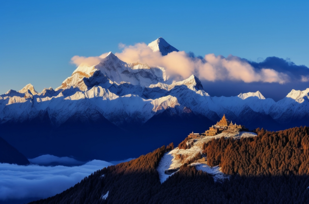早朝、ホテルの展望台で、朝日に染まる梅里雪山 ご来光を眺望して、山肌が徐々に明るくなり、上空を雲が流れる様子は油絵のような「日照金山」の絶景を鑑賞し、感動されます。