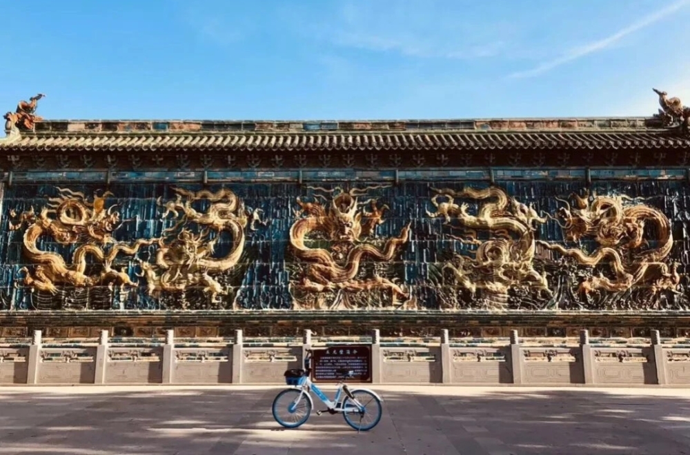 明の初代皇帝・朱元璋の十三男の朱桂の邸宅前に建てられた照壁(目隠し塀)です。壁の大きさは長さ45.5M、高さ8m、厚さ2m。北京の「故宮」と「北海」の九龍壁と合わせて、「中国九龍壁」と言われ、その中でも最大かつ最古のものです。