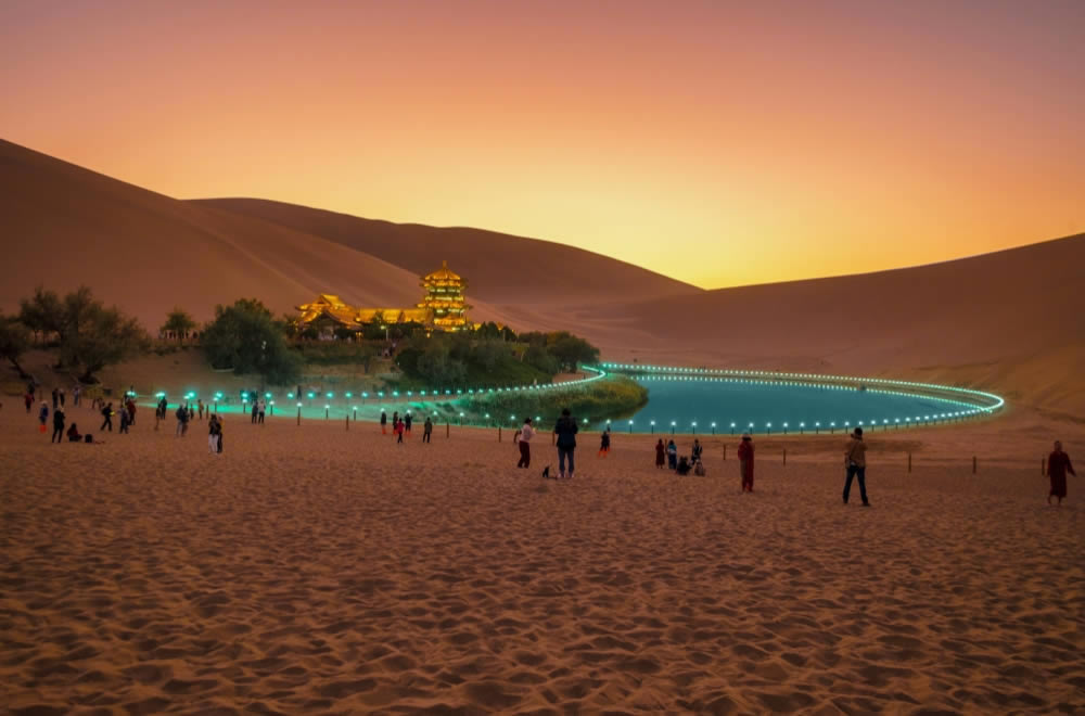 「史記」に「風が吹くと音を立て、楽を奏でているようだ」と記載されている「神沙山」とも呼ばれていた「鳴沙山」、ラクダ乗りできる三日月(月牙)の形をした泉「月牙泉」、地元の有名美食街、生活の匂いがする屋台「沙州市場」を見学した後、厳選した敦煌市内ホテルへご案内します。