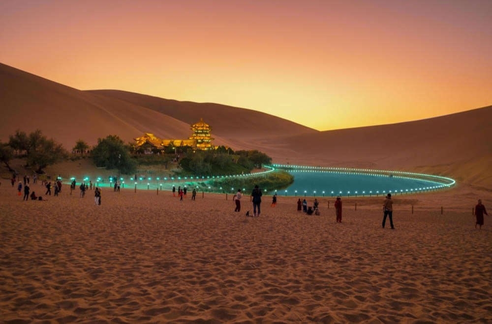 着後、「史記」に「風が吹くと音を立て、楽を奏でているようだ」と記載されている「神沙山」とも呼ばれていた「鳴沙山」、ラクダ乗りできる三日月(月牙)の形をした泉「月牙泉」、地元の有名美食街、生活の匂いがする屋台「沙州市場」を見学した後、厳選した敦煌市内ホテルへご案内します。