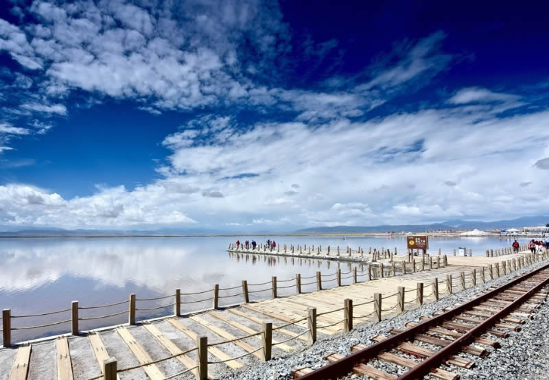朝07:30にガイドはお客様ホテルのロビーにて待機します。合流後、専用車にて青海烏蘭チャカ塩湖へ。着後、宮崎駿のアニメ『千と千尋の神隠し』の列車が海を走る童話の世界にしか見えないシーン、鏡張りの絶景で日本人にも有名なウユニ塩湖「チャカ塩湖(標高3,059ⅿ)」※片道トロッコ列車乗車体験※を観光後、チャカ塩湖のホテルへご案内します。