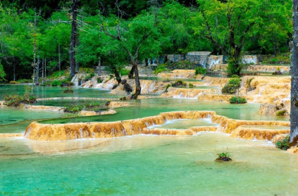 九寨溝から富士山より高い3,700mの峠を越えて黄色がかった乳白色の石灰棚を、天に向かって昇っていく龍に例えられた景勝地「黄龍」☆世界自然遺産☆(リフトにて上がり、ハイキングにて下山して黄龍寺 迎賓彩池 盆景池 争艶彩池 玉緑彩池、飛滝流輝 蓮台飛滝 五彩池など見学!)を観光後、専用車にて鎮江関駅へご案内します。