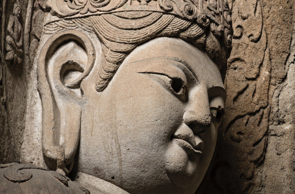 中国三大石窟の一つで、世界遺産に指定されております。大同市の西にある武周山麓に横たわり東西約1kmにわたって開削された雄大な石窟です。現存する主な洞窟が45ヶ所、彫刻造像は5万1千体余りあります。史上初の仏教大弾圧の後、仏教復興事業のシンボル的な存在として初期に造営された「曇曜五窟」はガンダーラやグプタ朝の様式の影響が色濃く、後期の石窟ではギリシャ様式に代表される西方起源の意匠が凝らされています。千五百年前北魏王朝の雲岡期と呼ばれる中国仏教彫刻芸術も豊富に見られます。